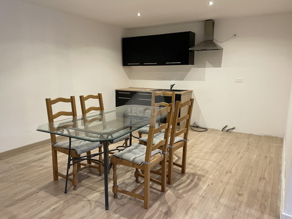 - En rez-de-chaussée, une entrée, un accès cave, un séjour ouvert, une cuisine aménagée et équipée d’une hotte aspirante, une salle de douche avec toilettes,