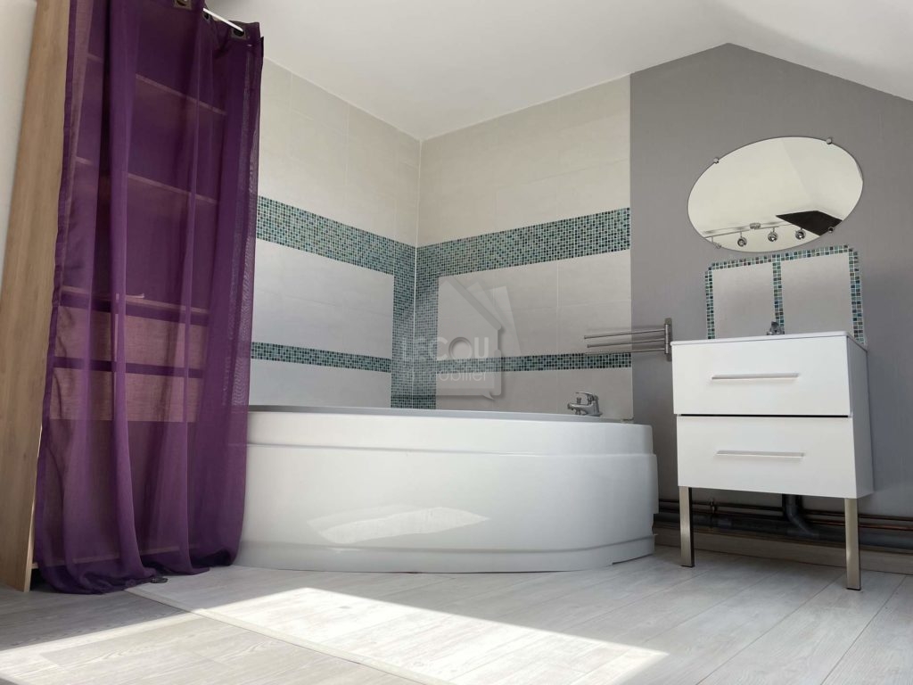 Cette maison offre une entrée, un séjour ouvert sur cuisine équipée, salle de douche, à l’étage palier, une chambre 10 m², une suite parents 15 m² avec baignoire d’angle, meuble vasque, comble. Cave, chauffage individuel électrique à inertie douce.